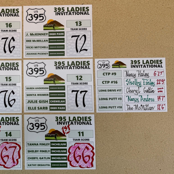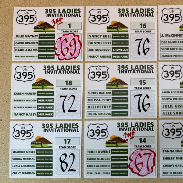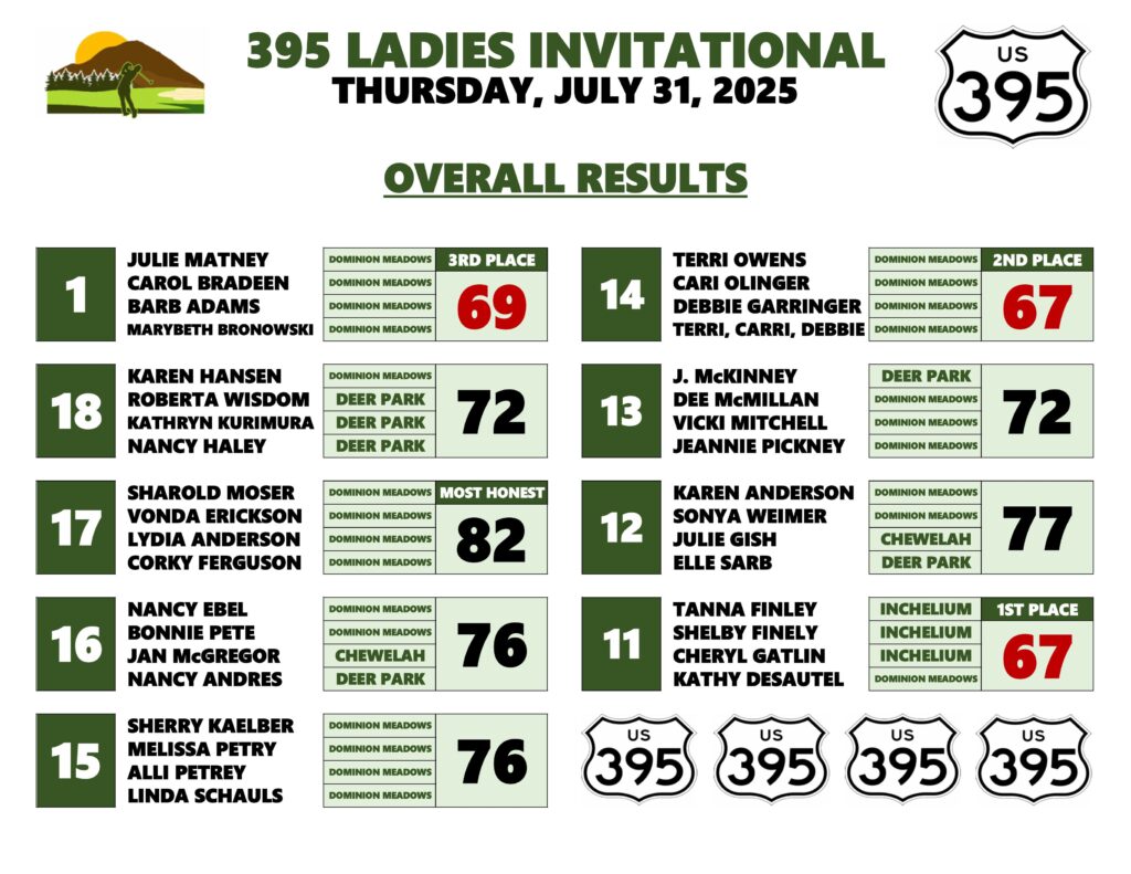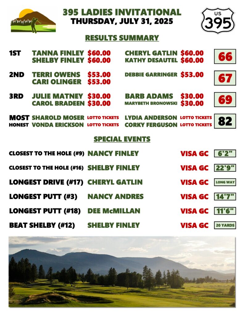 We enjoyed beautiful weather and exciting golf at the 395 Ladies Invitational on July 31. We hosted 36 ladies for play, including 11 ladies from Deer Park, Chewelah and Inchelium.